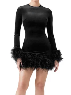 Women Autumn Dress Feather Trim Long Sleeve