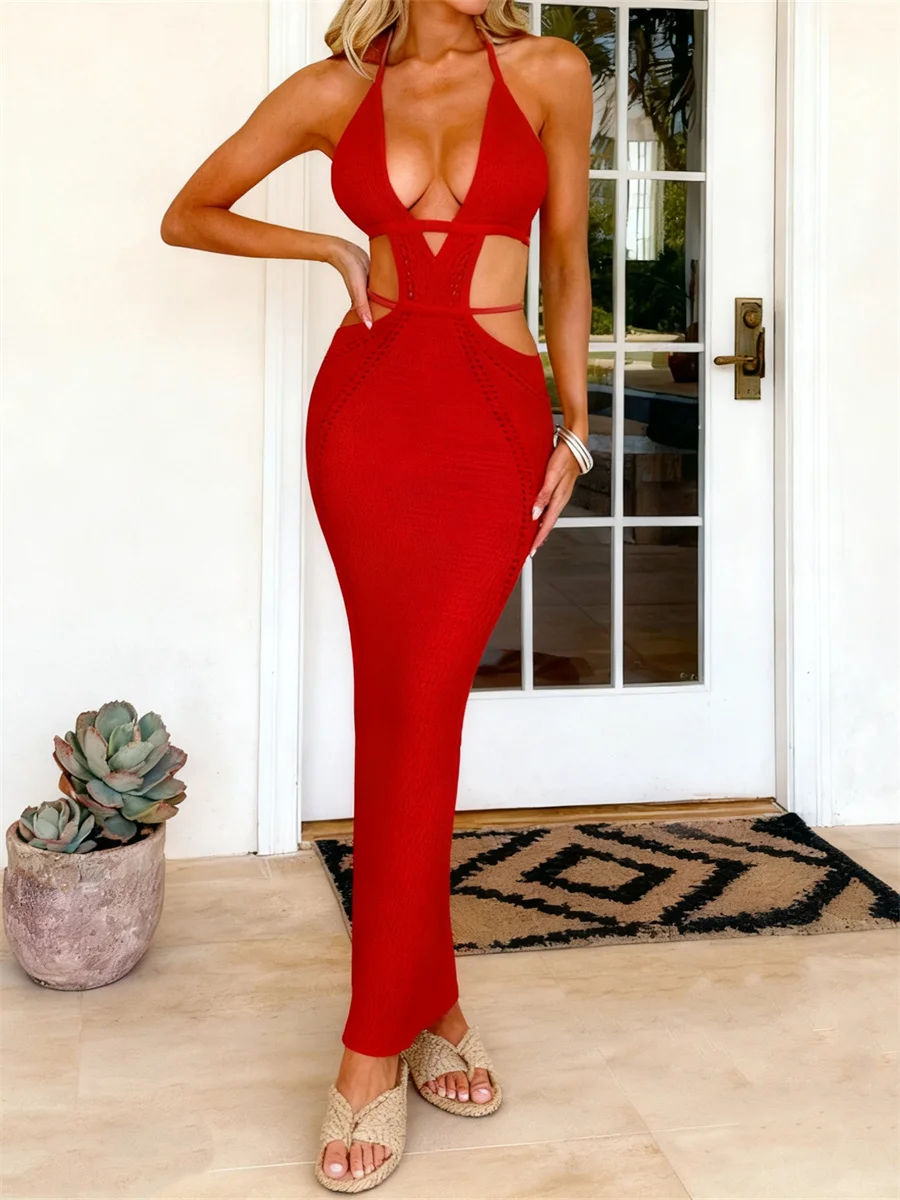 Womens Halter Bodycon Long Dress, Sleeveless Backless Hollow Out Knit Beach Dress