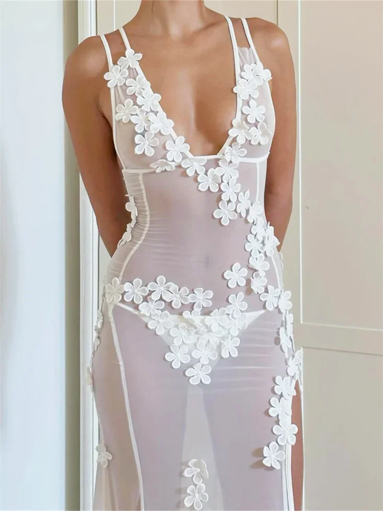 Sheer mesh, decorative flowers, deep v neck, ankle length, side slits, casual sleeveless beach dress, slim fit design easy to show your charming curves, keeping you comfortable all day.