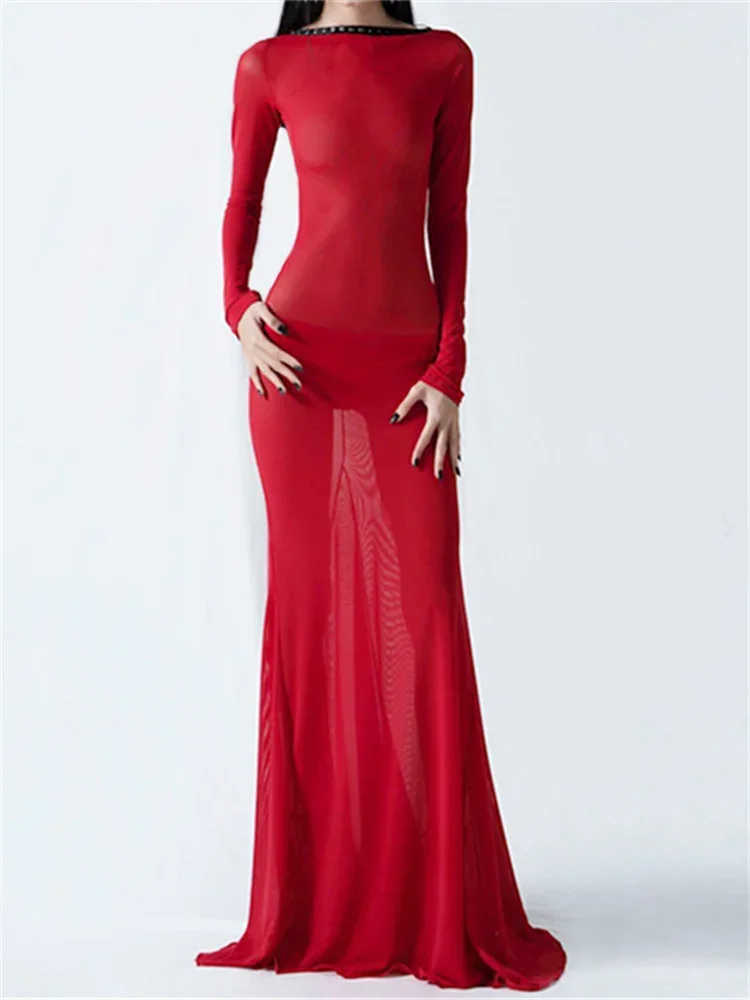 Women Long Bodycon Dress Solid Color See-Through Mesh Sheer Dress Long Sleeve Cross Tie-Up Backless Evening Party Dress