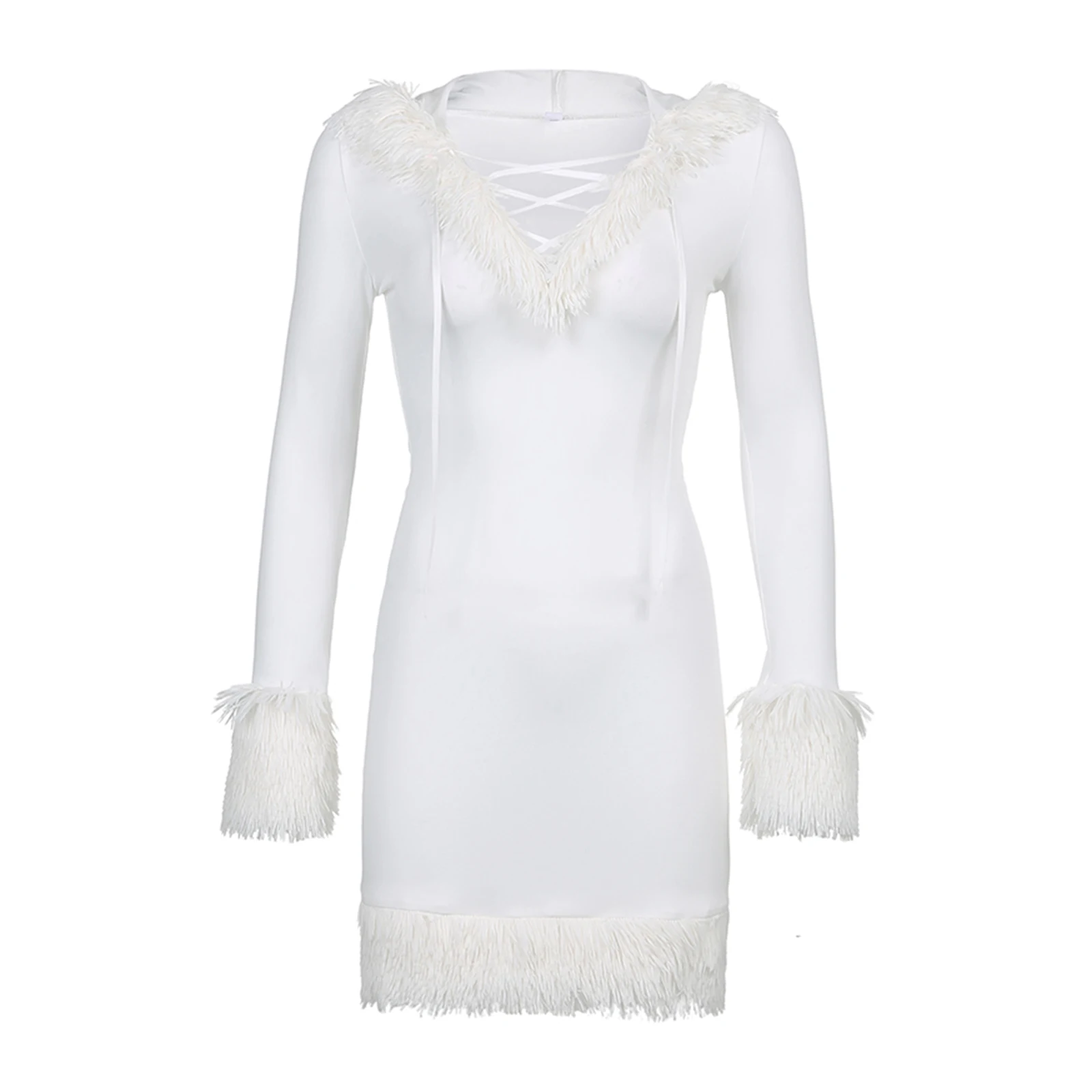 Women’s Dress, Plush Hem Splicing Frenulum V-neck Hooded Skirt